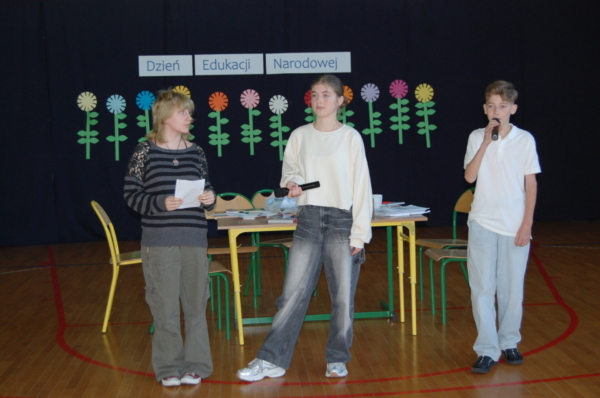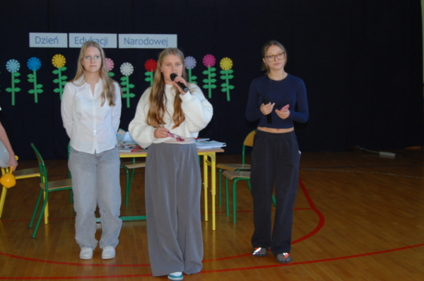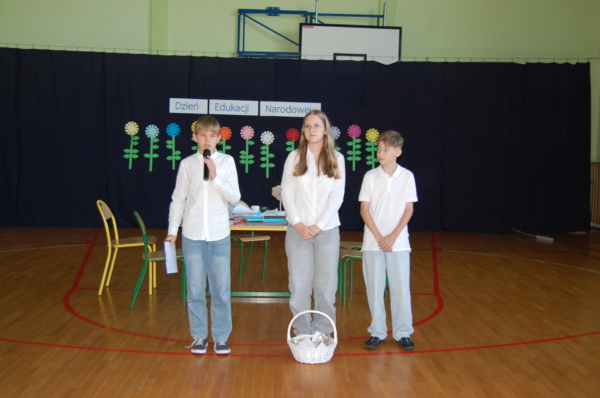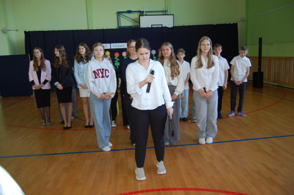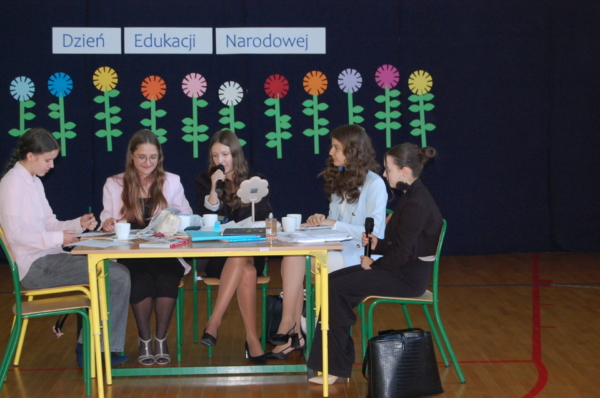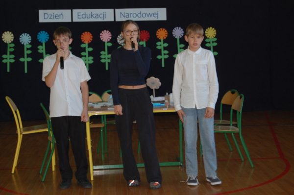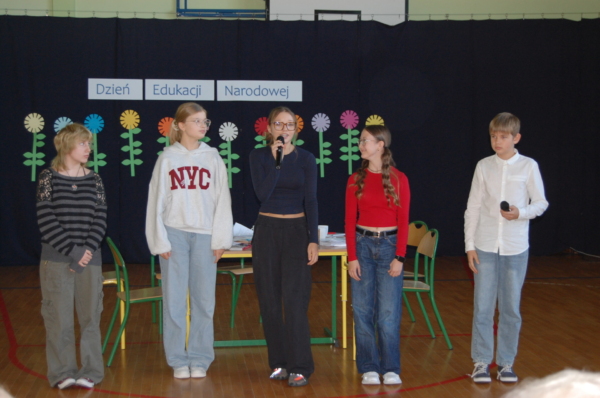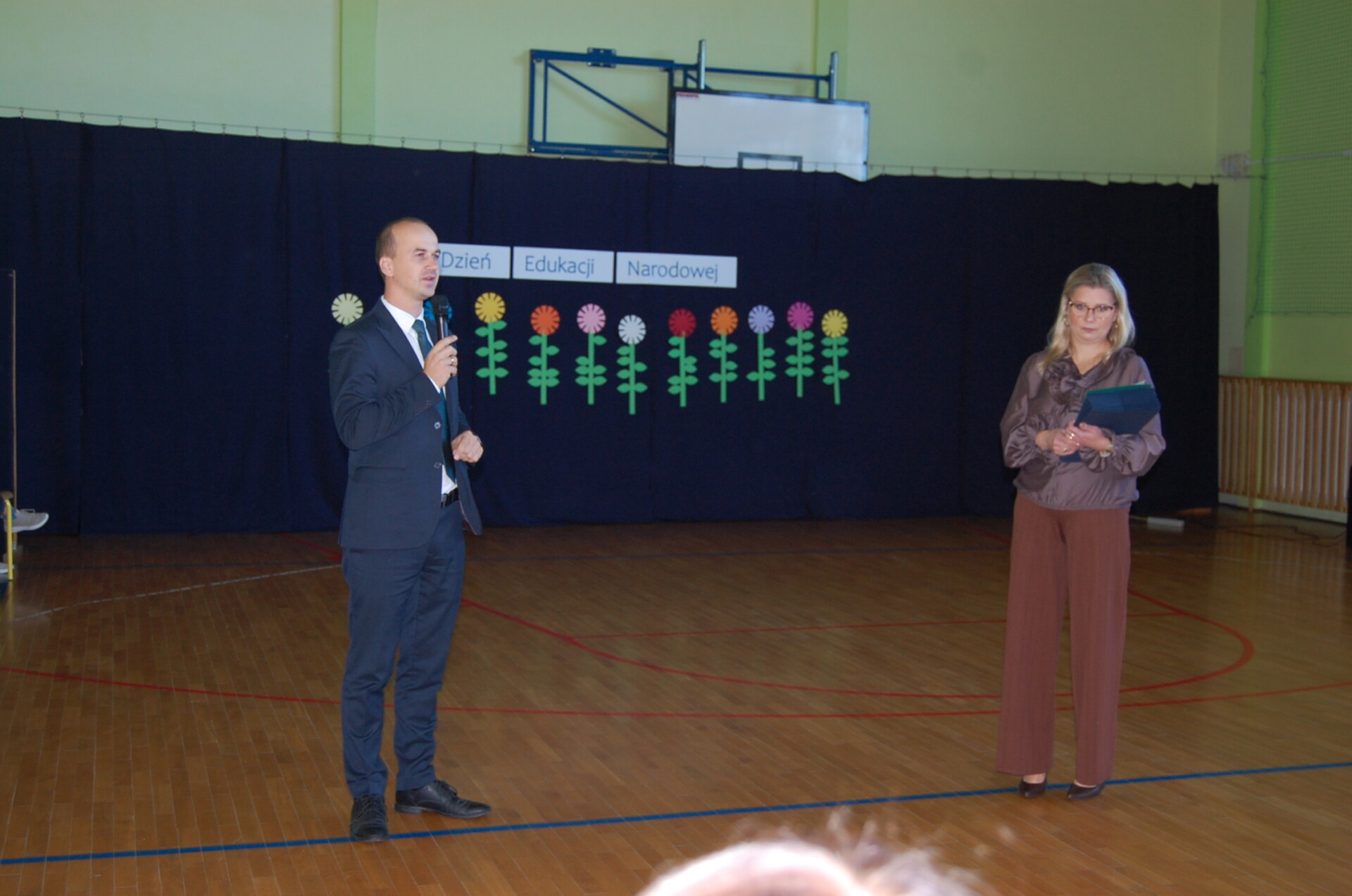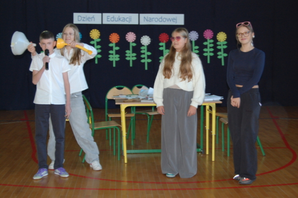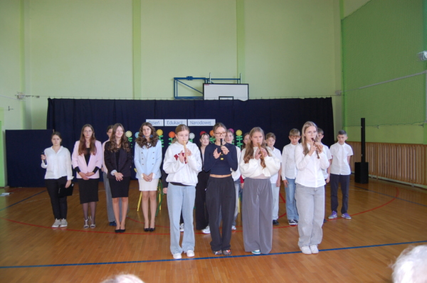 13 października w naszej szkole odbyła się uroczystość z okazji Dnia Edukacji Narodowej. W tym wyjątkowym dniu uczniowie w humorystyczny sposób wcielili się w role nauczycieli, prezentując scenki z pokoju nauczycielskiego oraz pokaz pomocy szkolnych, które wywołały wiele uśmiechu i radości. Ich występ był pełen ciepła, życzliwości i wdzięczności dla wszystkich pedagogów.